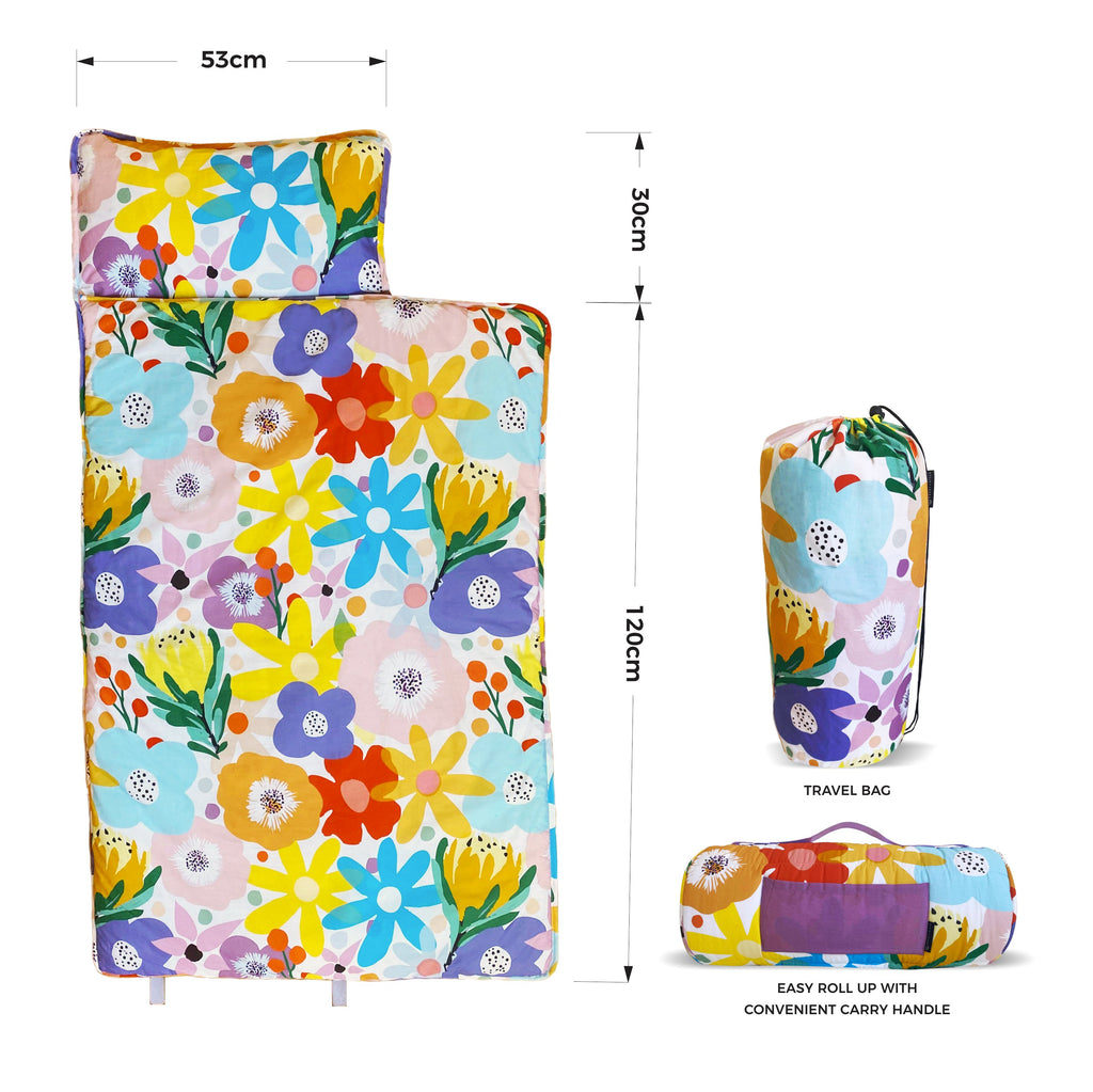 Our kids nap mats are perfect for your child's rest or sleep time at kindergarten, childcare, daycare, travelling, camping or home. The soft cotton fabric and sleek design featuring an all-in-one soft mattress, pillow and attached blanket make it the ultimate companion for convenient travel or to snuggle up in for movie night.